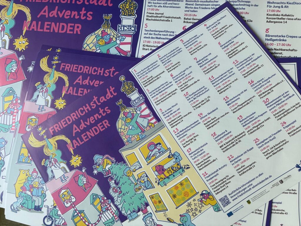 Ab sofort liegt der Friedrichstadt Adventskalender als A4 und A3 Poster im Stadtteilladen, Wachsbleichstr. 1, (Do./Fr. 14-18) und im riesa efau, Kultur Forum Dresden, Wachsbleichstr. 4 a (Mo + Do 10 – 13, Mo.-Fr. 16 – 19) aus und darf an den Kühlschrank, Wohnungstüren, Gartenzäune, in Kitas oder Arztpraxen usw. aufgehängt werden.