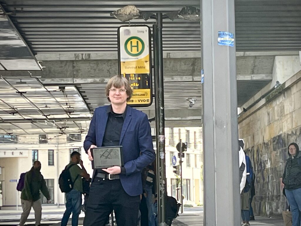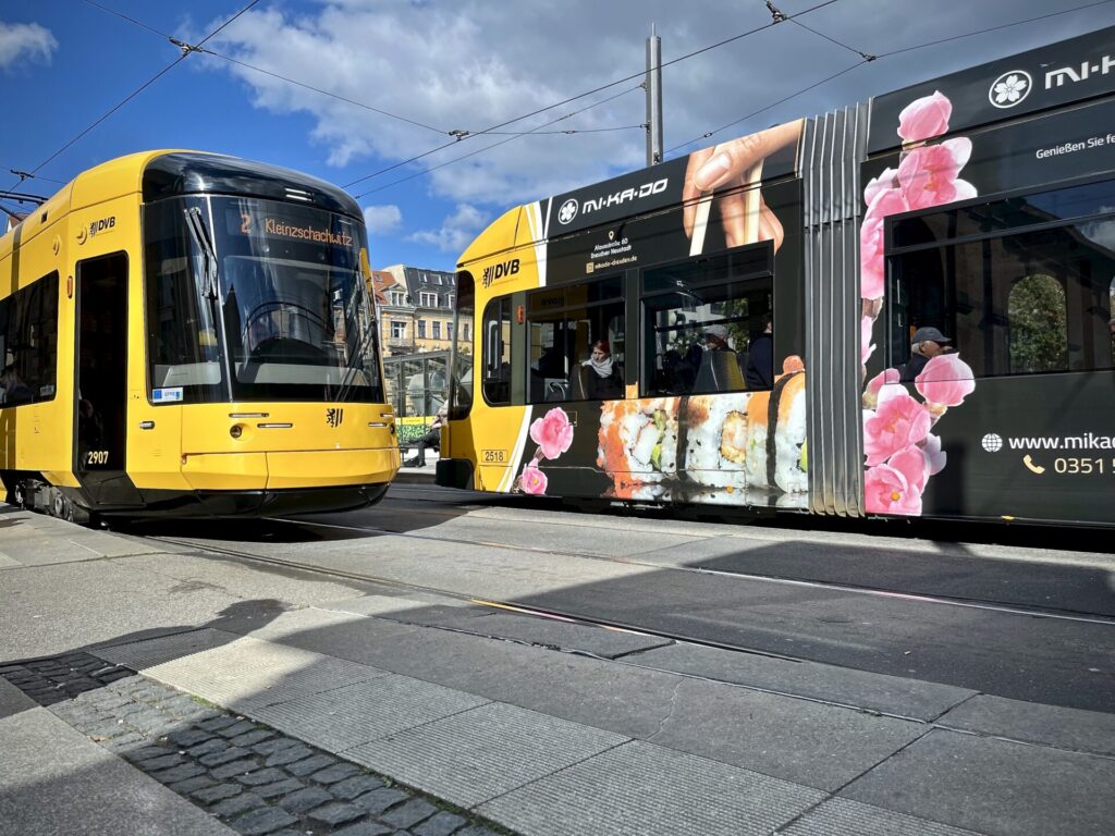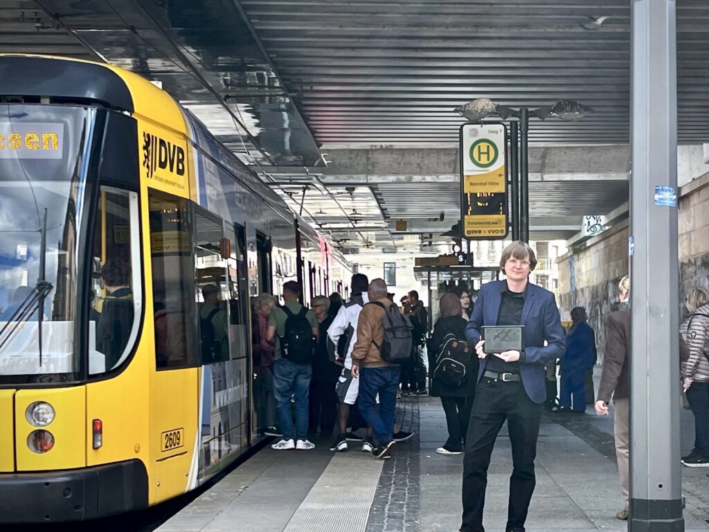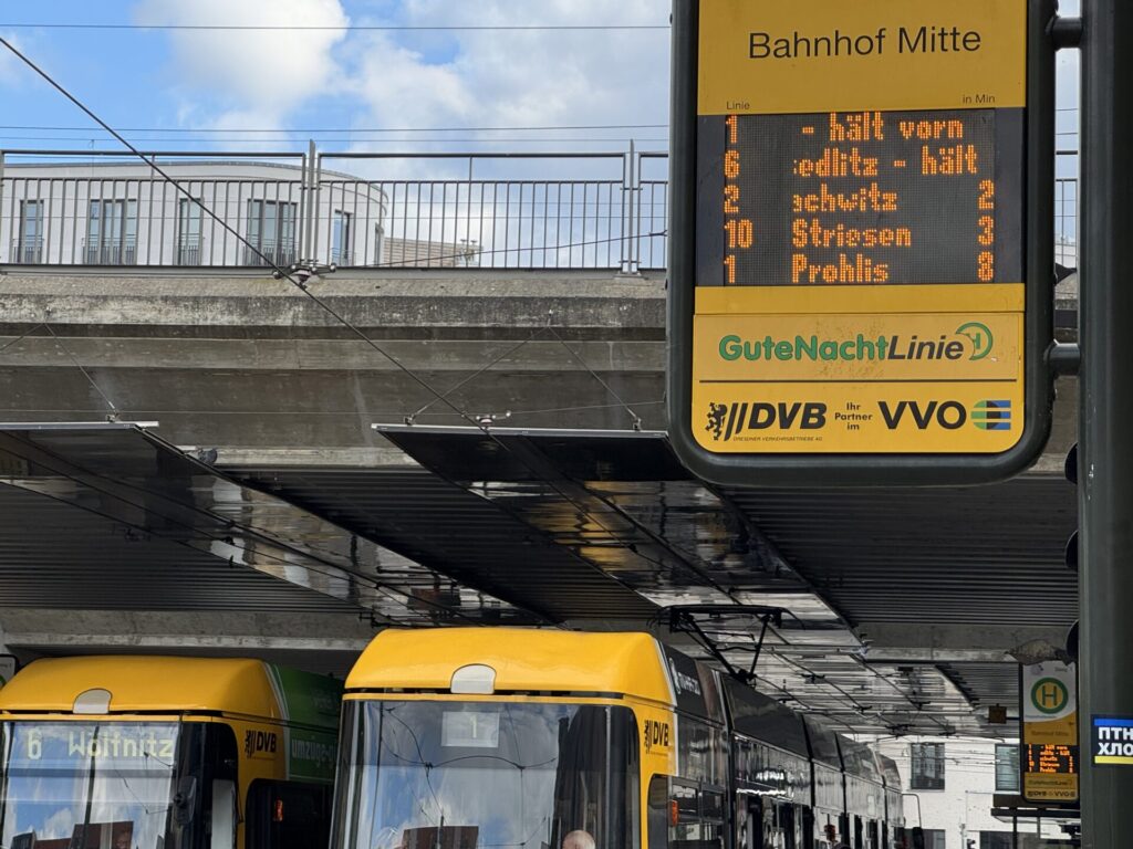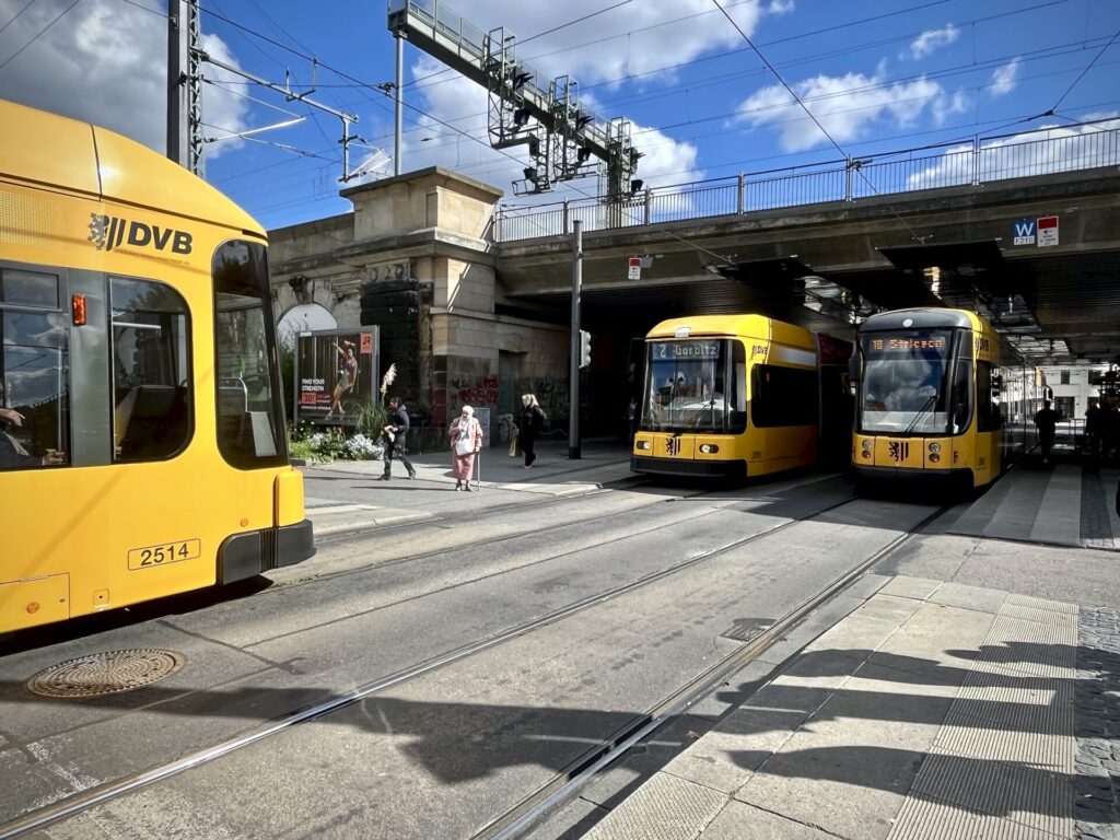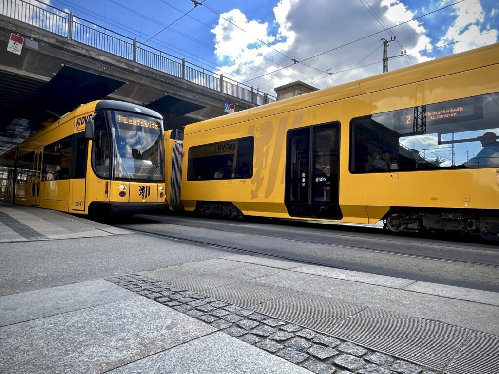 Als ich nach Dresden zog und erstmals gegenüber eines Einrichtungsmarktes auf „meine“ Bahn wartete, hielt eine Straßenbahn vorn. Dahinter fuhr die nächste ein und wartete unter der Brücke. Da dachte ich, diese rückt nach. Aber sie fuhr an mir vorbei. 70 Meter Bahnsteig gegen den Strom der aussteigenden Fahrgäste zu rennen, ist somit geringer.