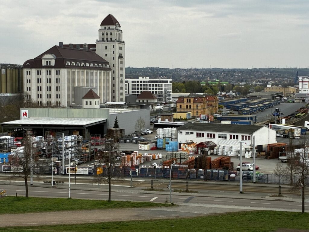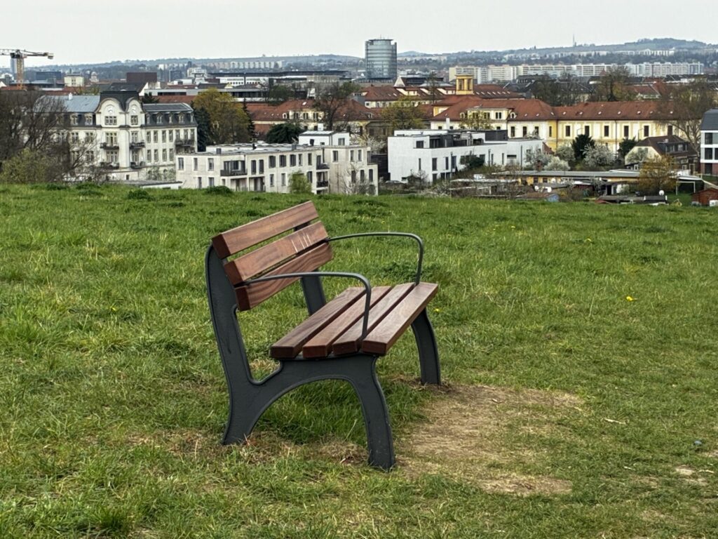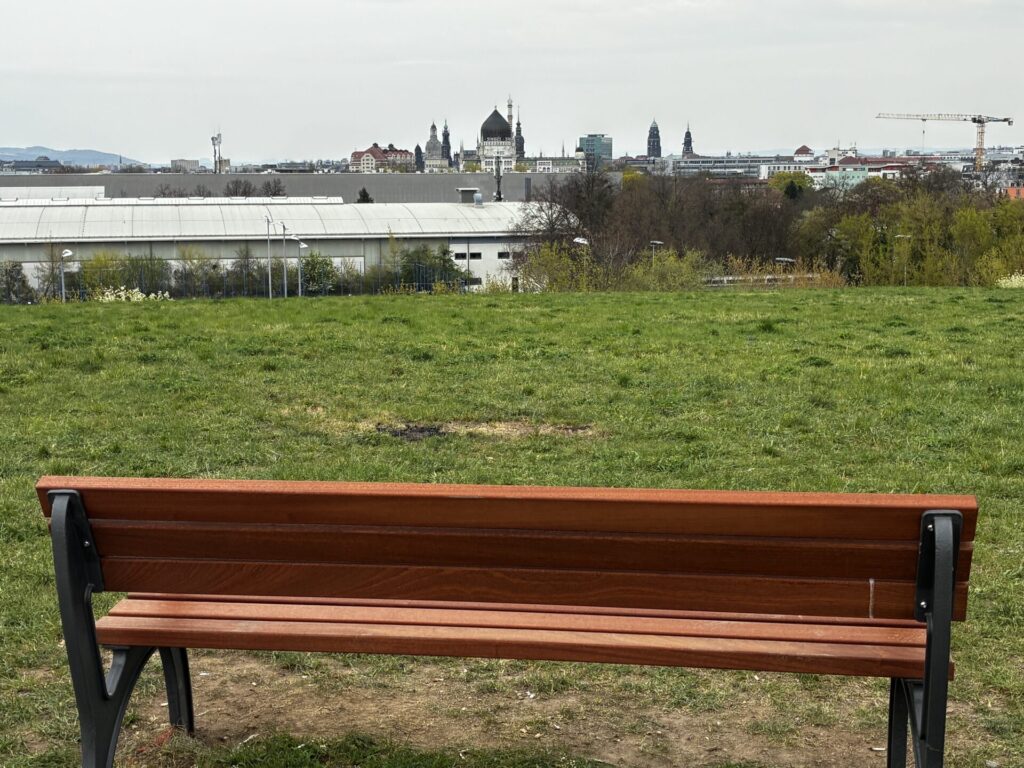 Die dritte Bank lädt den Blick ein, hin zur Yenidze, den Türmen der Innenstadt und den, bei sehr guter Sicht , Hängen rund um den Fernsehturm.