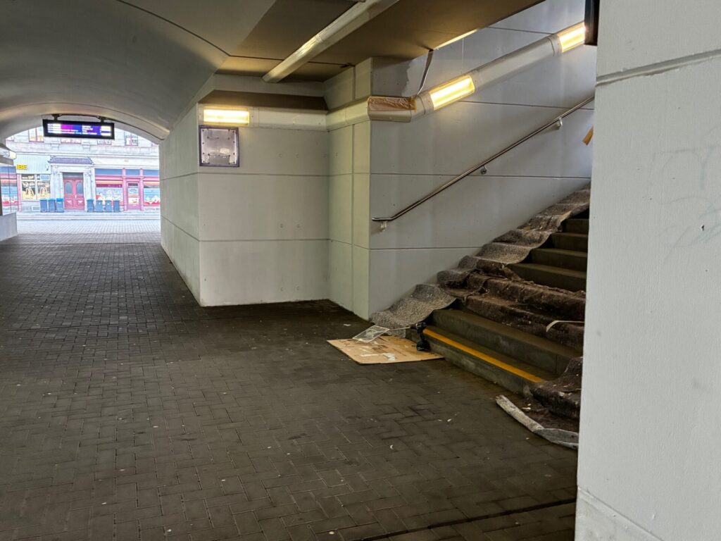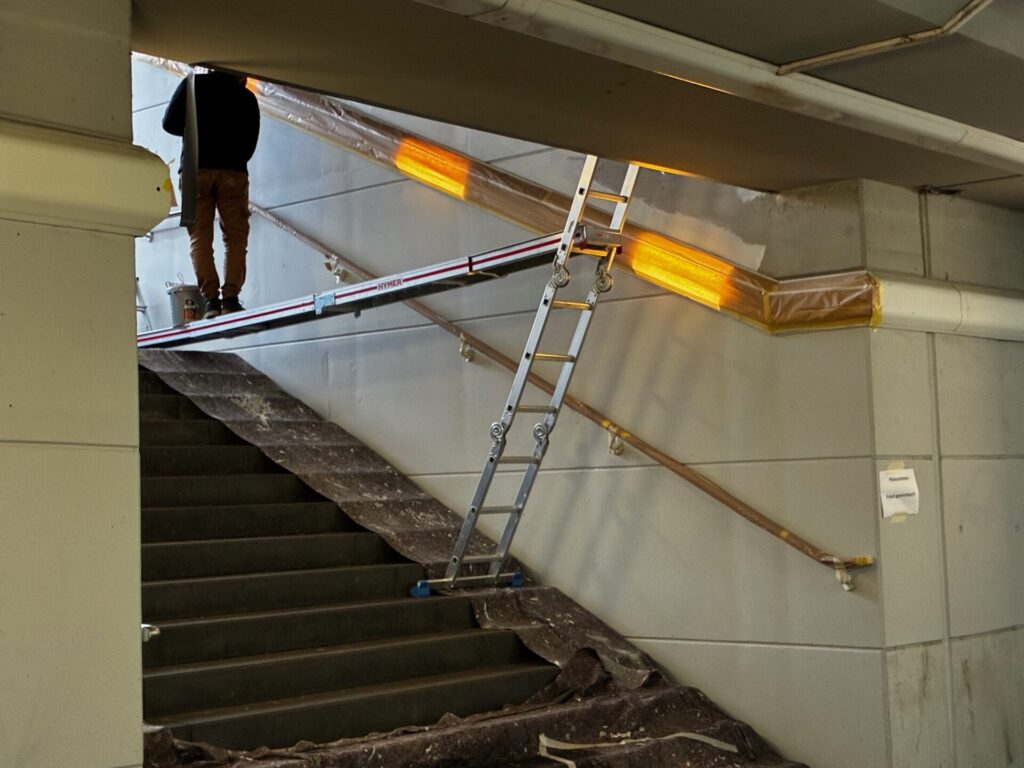 Die Deutsche Bahn AG lässt derzeit am Bahnhof Mitte Malerarbeiten durchführen. Einen neuen Anstrich bekommen die Aufgänge zu den Bahnsteigen. Dass dies schon lange an der Zeit war, konnten alle, die die Aufgänge zu den Bahnsteigen nutzen, sehen. Aufkleber, Schriftzüge und vieles anderes mehr zierten die Wände neben den Treppen und niederließen bei vielen ein komisches Bild von unserem Stadtteil.