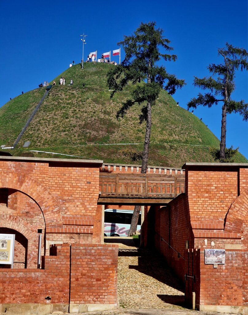 Wir sind wirklich überrascht: der kopiec Kosciuszki, also der Kosciuszko-Hügel, der an den polnischen Militäringenieur und Nationalhelden aus dem 18. Jahrhundert erinnert, ist aus der Nähe betrachtet gar nicht so groß wie aus ein paar Kilometern Entfernung – und nur mit einer Eintrittskarte durch die Ausstellung hindurch zu erreichen. Von oben hat man jedoch eine schöne Aussicht.