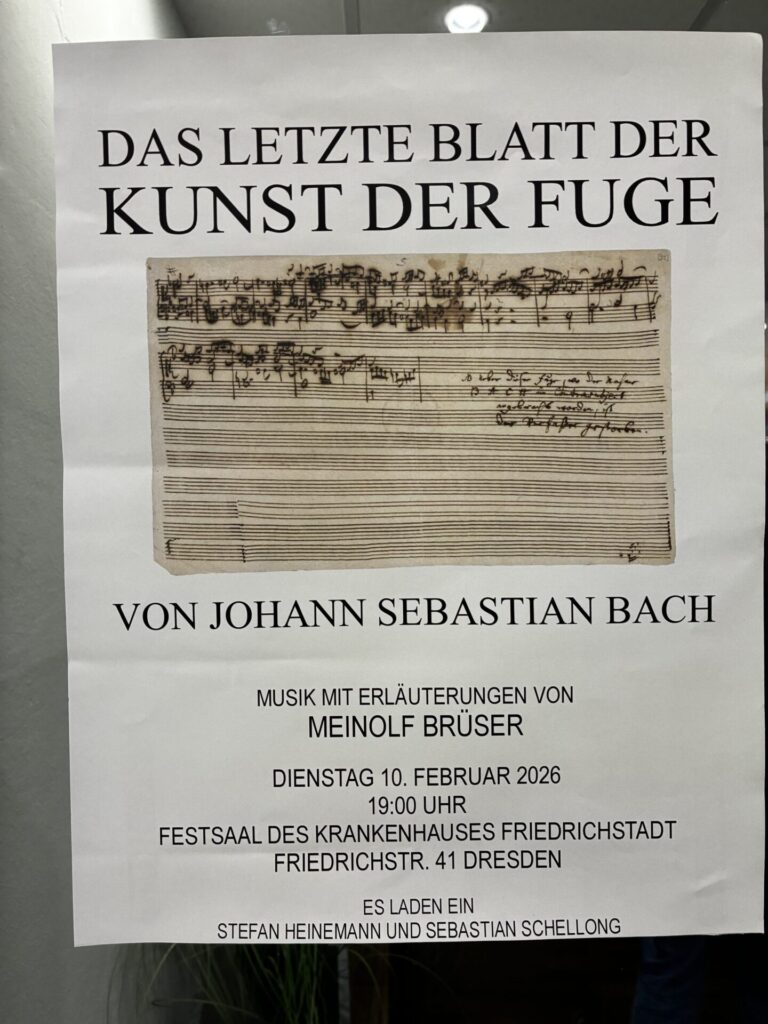 Für alle Freundinnen und Freunde der Kunst der Fuge, gibt es morgen ein Konzert im Festsaal des Krankenhauses Friedrichstadt.