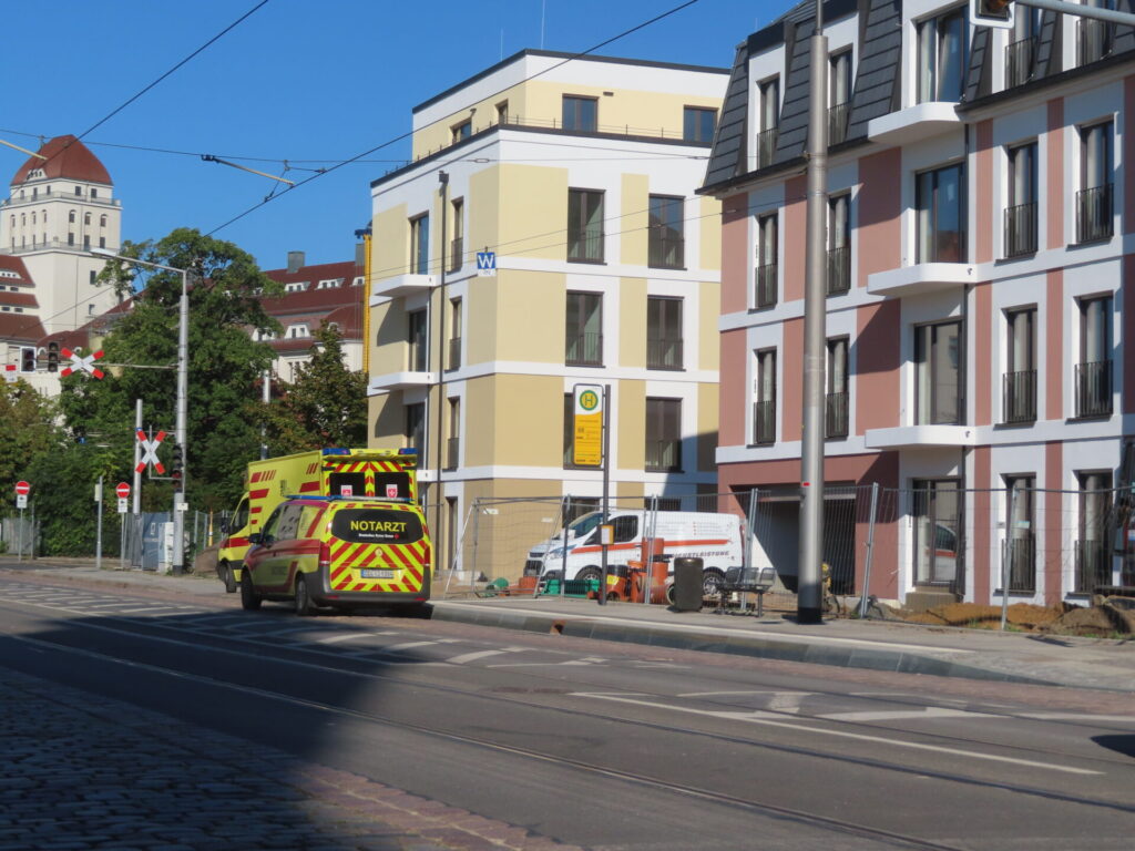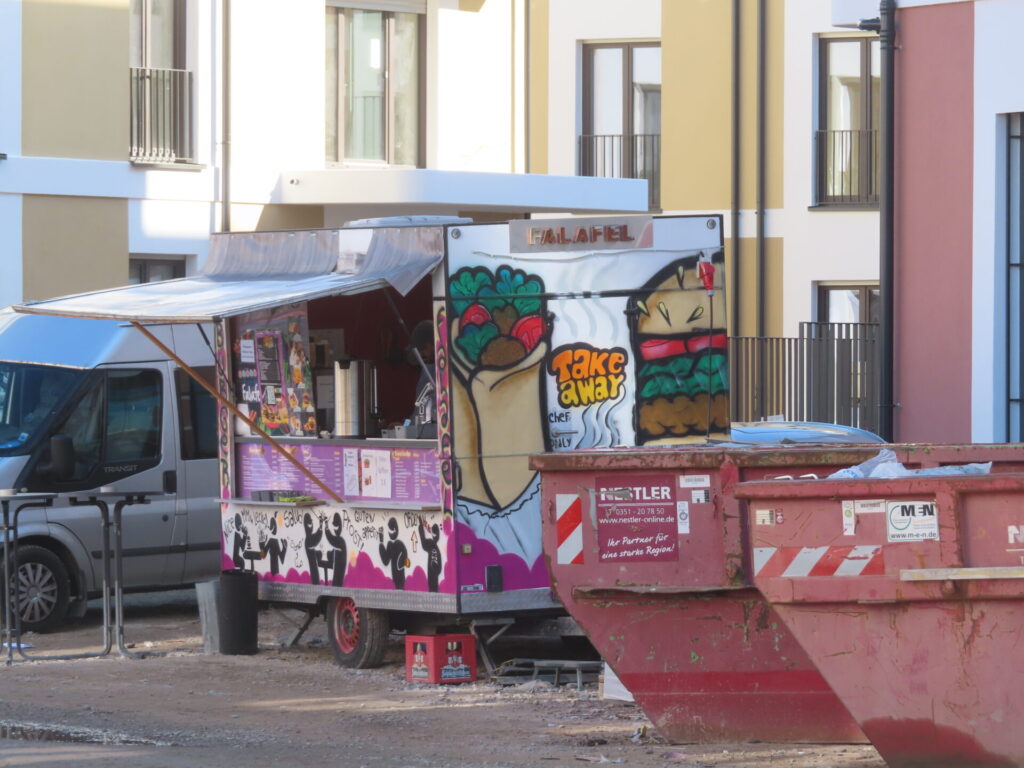 Für die auf dem Bau aurbeitenden Menschen wurde sogar ein Imbisswagen mit Falafeln und anderen Leckereien ins Gelände gestellt. Hier können sich aber auch vorbeigehende Menschen stärken, „Ich habe für alle etwas Leckeres“ sagt uns der Mitarbeiter im Wagen. Hoffen wir, daß die auf dem Bild zusehenden Krankenwagen keinen schwerwiegenden Einsatz auf der Baustellen hatten.