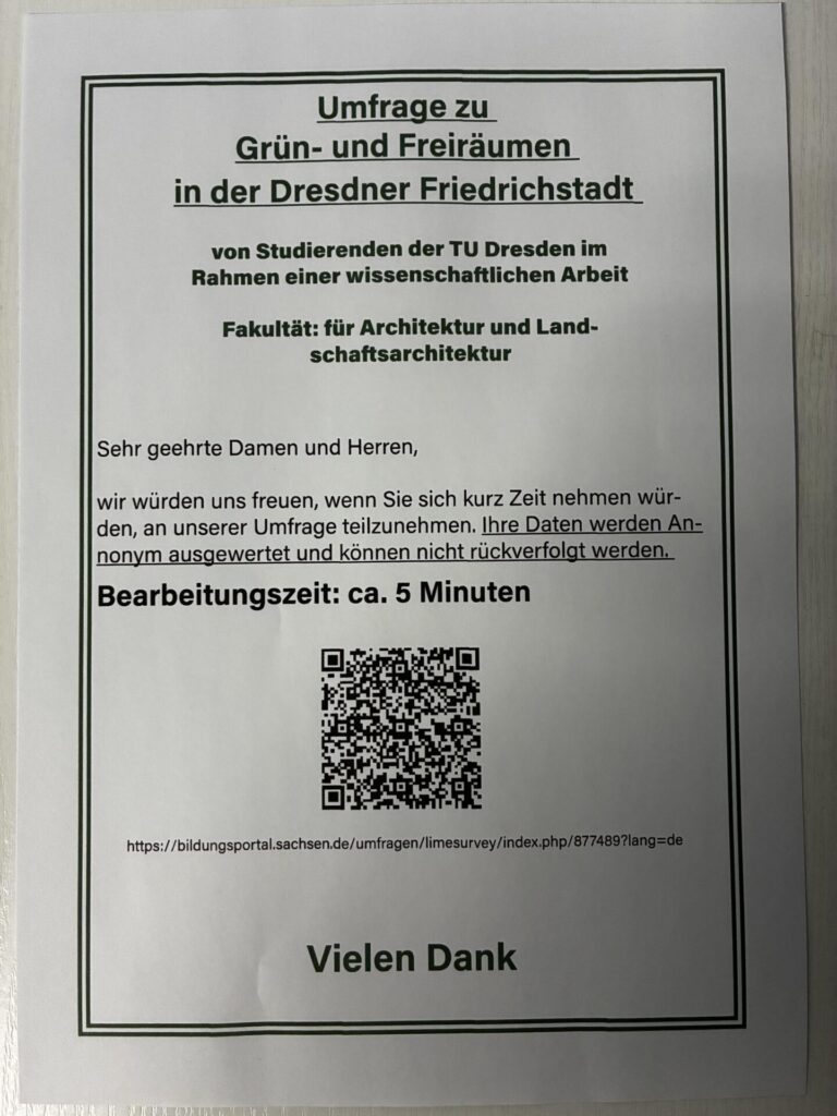 Ziel der Umfrage ist es, Frei- und Grünraumpotentiale in der Dresdner Friedrichstadt zu identifizieren und daraus mögliche Entwicklungskonzepte abzuleiten. Die Datenerhebung erfolgt im Rahmen einer wissenschaftlichen Arbeit im Fachbereich der Architektur der TU Dresden.