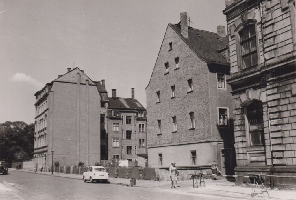 Wer heute durch die Wachsbleichstraße läuft, sieht vor allem Blech. Stoßstange an Stoßstange reihen sich die Fahrzeuge bis zur Weißeritzstraße. Ein Blick in das Jahr 1965 zeigt ein völlig anderes Bild. Auf dem Kopfsteinpflaster steht ein einsamer Trabant 500 fast verloren vor der Kulisse der Hausnummer 8.