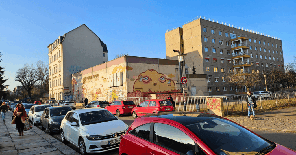 Statt öder Fassaden trägt heute ein großformatiges Werk der Gruppe Zonenkinder, das im Rahmen des Projekts „CityBilder“ entstand, zur Aufwertung der Straße bei.