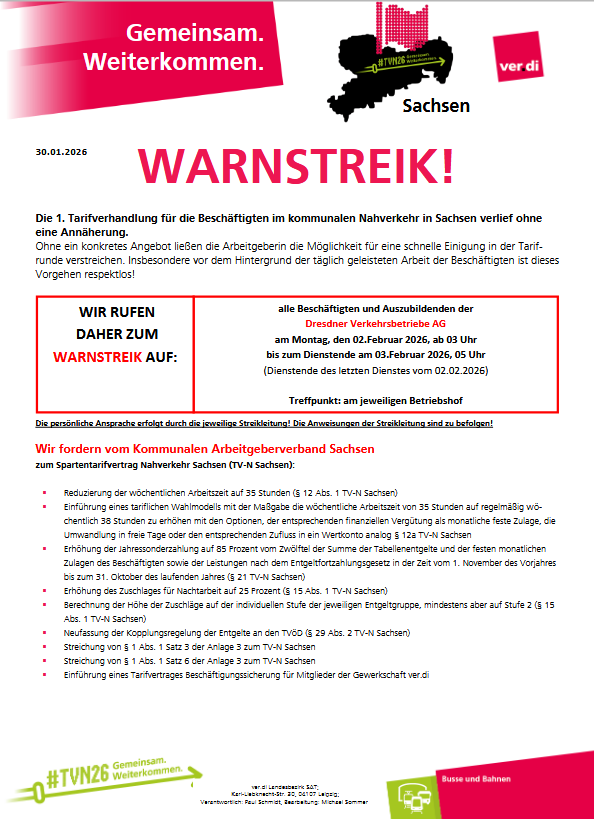 Die Gewerkschaft ver.di ruft zum bundesweiten Warnstreik am 2. Februar 2026 auf. Auch die Beschäftigten und Auszubildenden der DVB AG sind zum Streik aufgerufen.